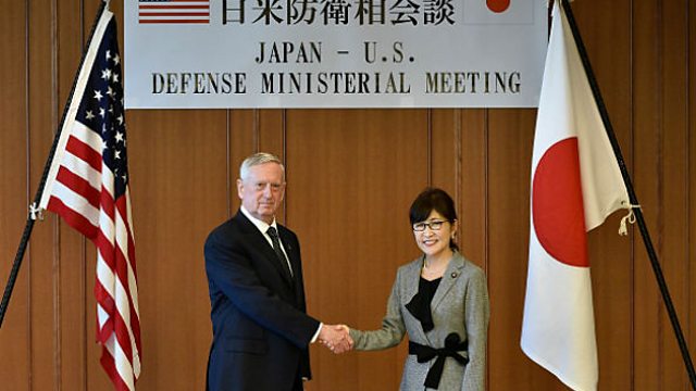 (Image: US Secretary of Defense James Mattis shakes hands with Japanese Defence Minister Tomomi Inada in Tokyo on 4th February 2017. Credit: Franck Robichon/AFP/Getty Images)