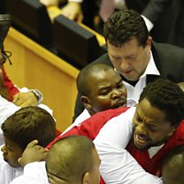 (Picture: Economic Freedom Fighters in red are forcibly removed from parliament in Cape Town, South Africa. Credit: AP)