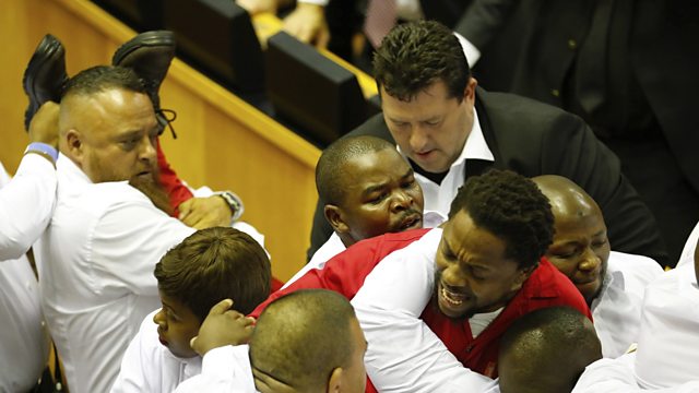 South Africa's President Zuma's State of the Nation speech is disrupted by opposition MPs brawling with security staff.