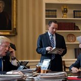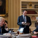 (Photo: President Donald Trump speaks on the phone in the Oval Office alongside members of his team. Credit: Drew Angerer/Getty Images)