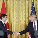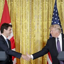 (President Donald Trump and Canadian Prime Minister Justin Trudeau shake hands during a joint news conference in the White House. Credit: AP)