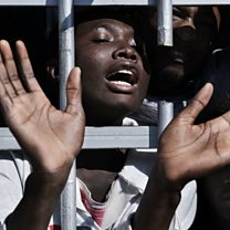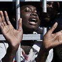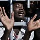 (Photo: A migrant gestures from behind the bars of a cell at a detention centre in Libya. Credit: UNICEF)
