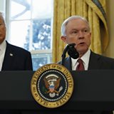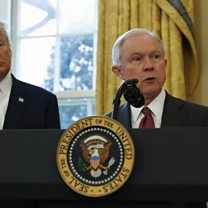 (Photo: President Donald Trump listens as Attorney General Jeff Sessions speaks in the Oval Office of the White House in Washington on 2nd February 2017. Credit: AP)
