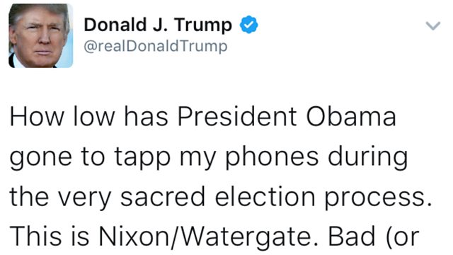 (Photo: President Trump tweet accusing Obama of wire-tapping. )