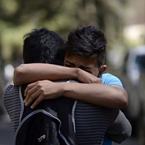 (Picture: A survivor of the fire embraces a relative. Credit: AFP)