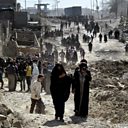 (Photo: People walk in west Mosul after a food distribution from the Iraqi troops on March 10, 2017. Credit: ARIS MESSINIS/AFP/Getty Images)