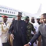 (Photo: President Buhari arrives at a Kaduna military airbase. Credit: BBC)