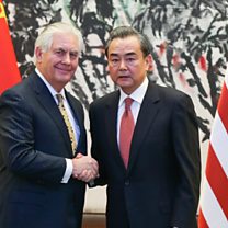 (Photo: Chinese Foreign Minister Wang Yi shakes hands with U.S. Secretary of State Rex Tillerson in Beijing, China. Credit: Getty Images)