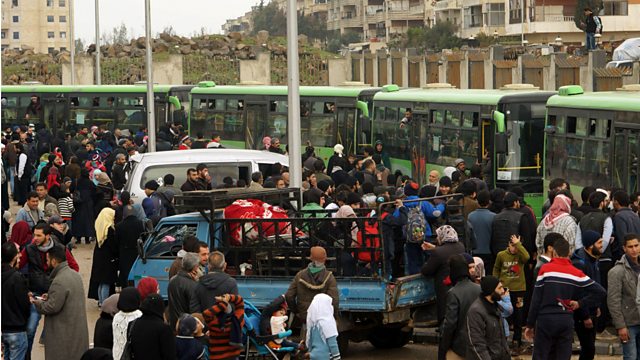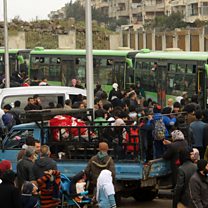 (Photo: Syrian rebels and their families preparing to board buses ahead of their evacuation from the rebel-held al-Wair neighbourhood. Credit: AFP)