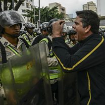 (Photo: Venezuelan opposition deputie Rafael Guzman confronts National Guard during a protest in Caracas; Credit: AFP).