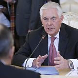 (Photo: US Secretary of State Rex Tillerson gestures to Sergei Lavrov in Moscow. Credit: EPA.)