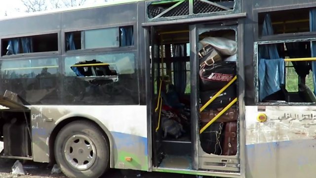 (Photo: A damaged bus at the scene of a car bomb attack that targeted buses evacuating civilians near Aleppo; Credit: Thiqa News Agency (TNA) via European Press Agency)
