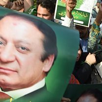 (Photo: Supporters of the ruling party Pakistan Muslim League-Nawaz (PML-N) carry posters of Prime Minister Nawaz Sharif as they hold a rally after a Supreme Court verdict on the Panama Papers in Lahore. Credit: AFP)