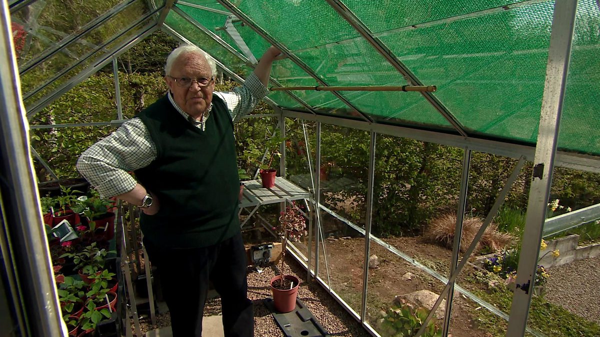 Brian and Carole admire flowers in the woodland garden whilst Jim protects glasshouse plants from roasting in the sun.