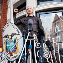 (Picture: Julian Assange puts his fist in the air as he steps out to speak to the media from the balcony of the Embassy Of Ecuador. Credit: Jack Taylor/Getty Images)