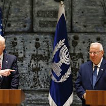 Photo: US President Donald Trump (L) and Israel"s President Reuven Rivlin give a press conference at the president's residence in Jerusalem on May 22, 2017. Credit: Gali Tibbon/AFP/Getty Images)