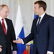 (Image: French President Emmanuel Macron (R) shakes hands with Russian President Vladimir Putin (L) Credit: Philippe Wojazer/AFP/Getty Images)