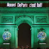 (photo: The Arc de Triomphe in Paris France, with the words 'the Paris accord is done' illuminated across the top, celebrating the first day of the Paris climate accord on 4 November 2016. Credit: AFP/Getty).