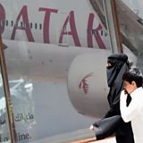 Picture description: A Saudi woman and a boy walking past the Qatar Airways branch in the Saudi capital Riyadh, after it had suspended all flights to Saudi Arabia following a severing of relations between major gulf states and gas-rich Qatar.