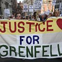 (Photo: Protesters attending a rally calling for justice for those affected by the Grenfell Tower fire march toward Downing Street in Westminster. Credit: Getty Images.)