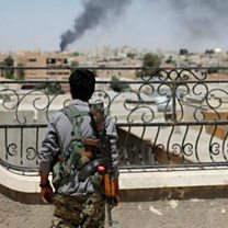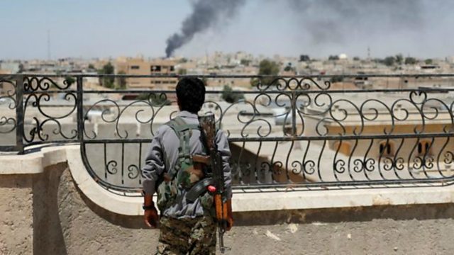 (Photo: A Kurdish fighter looks across Raqqa after a coalition air strike; Credit: Reuters).