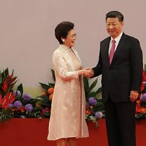 (Photo: President Xi Jinping shakes hands with Carrie Lam during a swearing-in ceremony in Hong Kong on July 1, 2017. Credit: Getty Images)