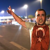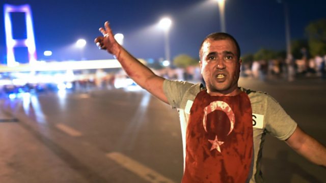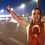 (Image: A man covered with blood points at the Bosphorus Bridge during Turkish military clashes with local people in Istanbul on July 16, 2016. Credit: Bulent Kilic/AFP/Getty Images)