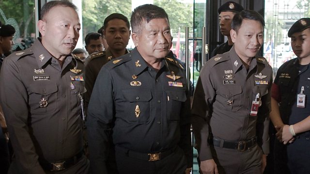 (Photo: Thai Army Lieutenant General Manas Kongpan (centre) surrounded by police as he turns himself in at police headquarters in Bangkok in 2015. AFP/Getty Images)