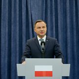 (Image: Polish President Andrzej Duda during a press conference in the presidential palace in Warsaw. Credit: EPA/Pawel Supernak)