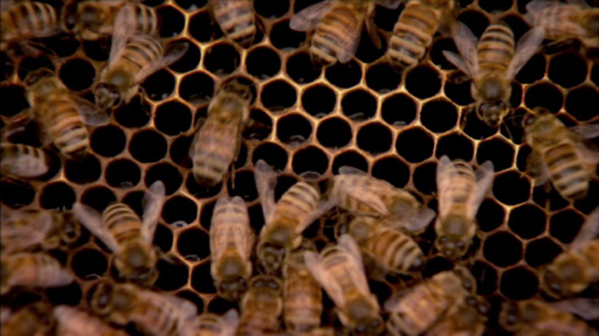 Marcus du Sautoy visits a bee-keeper and explores how bees create their honeycombs. If they are going to tessellate they have a limited number of regular polygons they could choose from, but the hexagon is the most efficient – giving the maximum storage area for the least amount of wax. In fact, the bees do not create hexagons, but circular cells which, as is shown using bubble arrays, pull together to make hexagons due to surface tension. This same principle is behind other polygon formations in the natural world too.