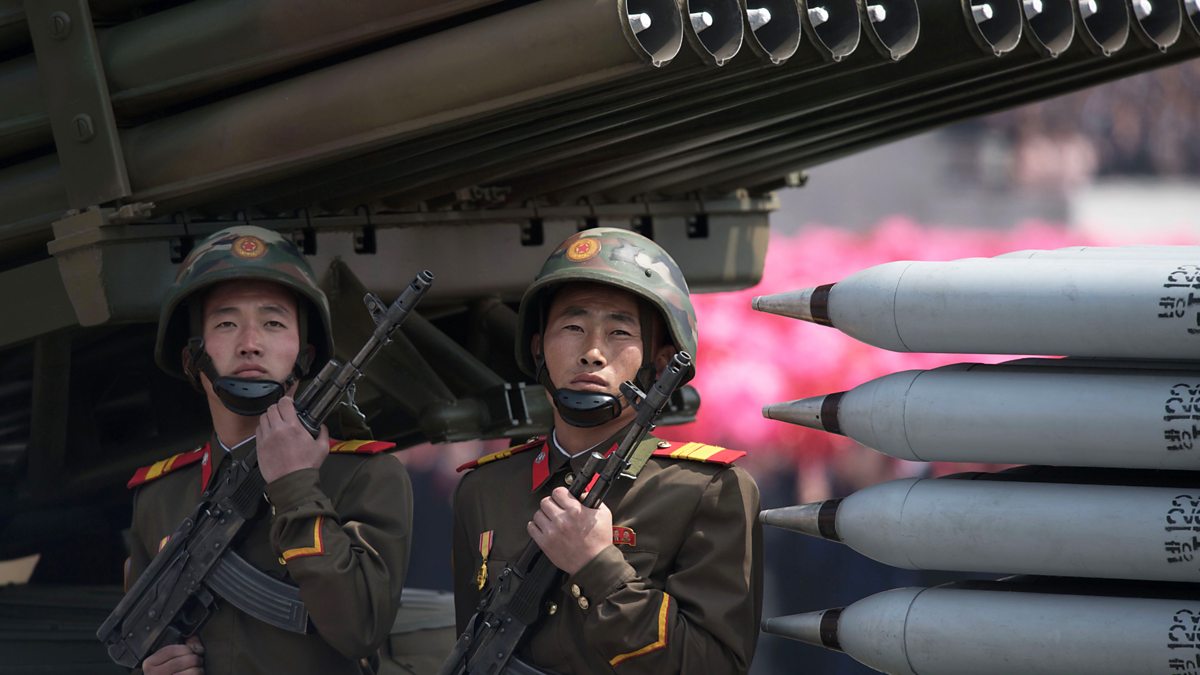 (image: Members of the Korean People's Army (KPA) ride on mobile missile launchers during a military parade to showcase their strength. Credit: Ed Jones / Getty Images)