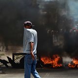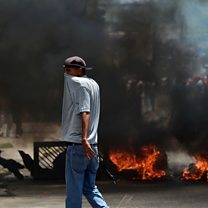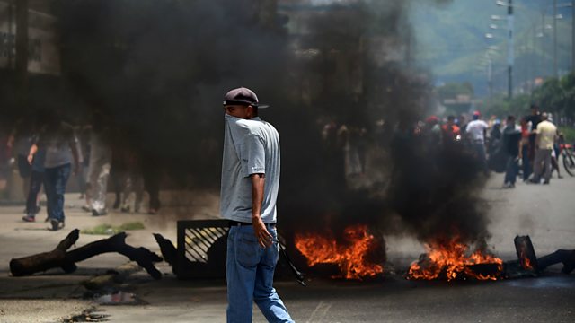 (Image: An anti-government activist stands near a barricade burning in flames in Valencia. Credit: Getty Images).