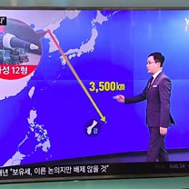 Picture: A South Korean soldier walks past a television screen showing a graphic of the distance between North Korea and Guam at a railway station in Seoul on August 9, 2017.