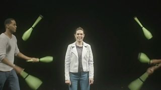 Keep still! Presenter Lindsey Chapman gets a juggling lesson from the professionals.