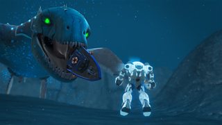 Mae siarc cynhanesyddol, y megalodon, yn llyncu'r Rover! The Rover is swallowed by a hu...