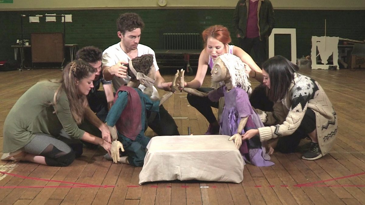 Puppeteers from the company behind War Horse, Gyre and Gimble, reveal their techniques in rehearsal for their latest production. Based on a Victor Hugo novel, the show is called The Grinning Man and tells the story of a disfigured hero, Grinpayne, who is employed as a fairground freak and falls in love with a sightless girl called Dea.