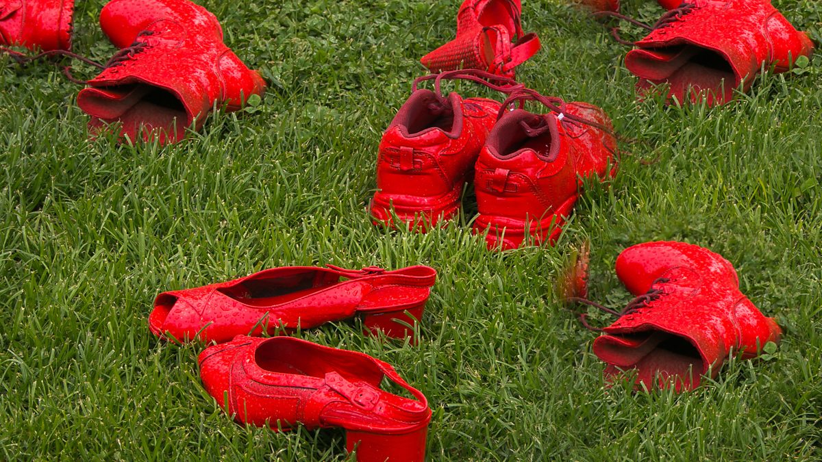 Image: Red shoes in the green meadow, the symbol of the violence against women.