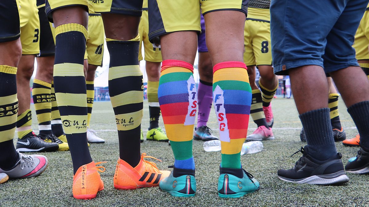 (Image: Footballer’s legs with rainbow socks. Credit: BBC)