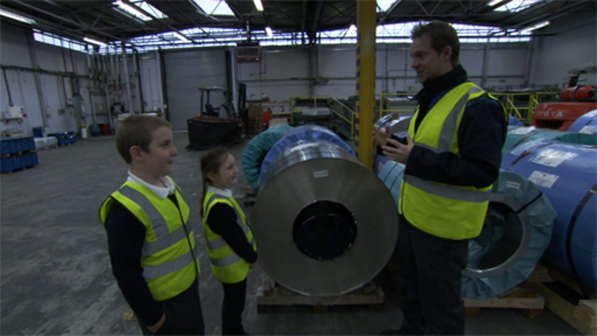Two children discover how iron ore is turned into a steel biscuit tin.