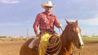Y cowboi o Geredigion sy'n brandio lloi ar fferm yn Texas