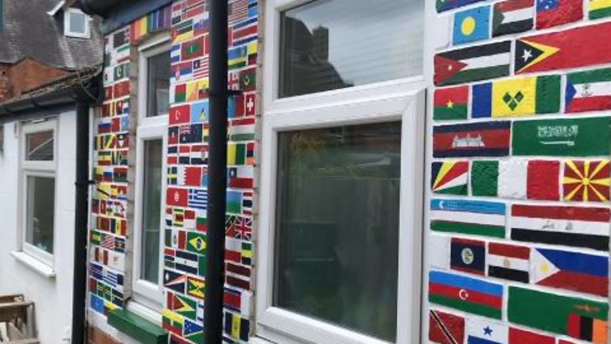 Sarah Whitney, and her two children, created a wall of flags on the back of their house in Lincoln.