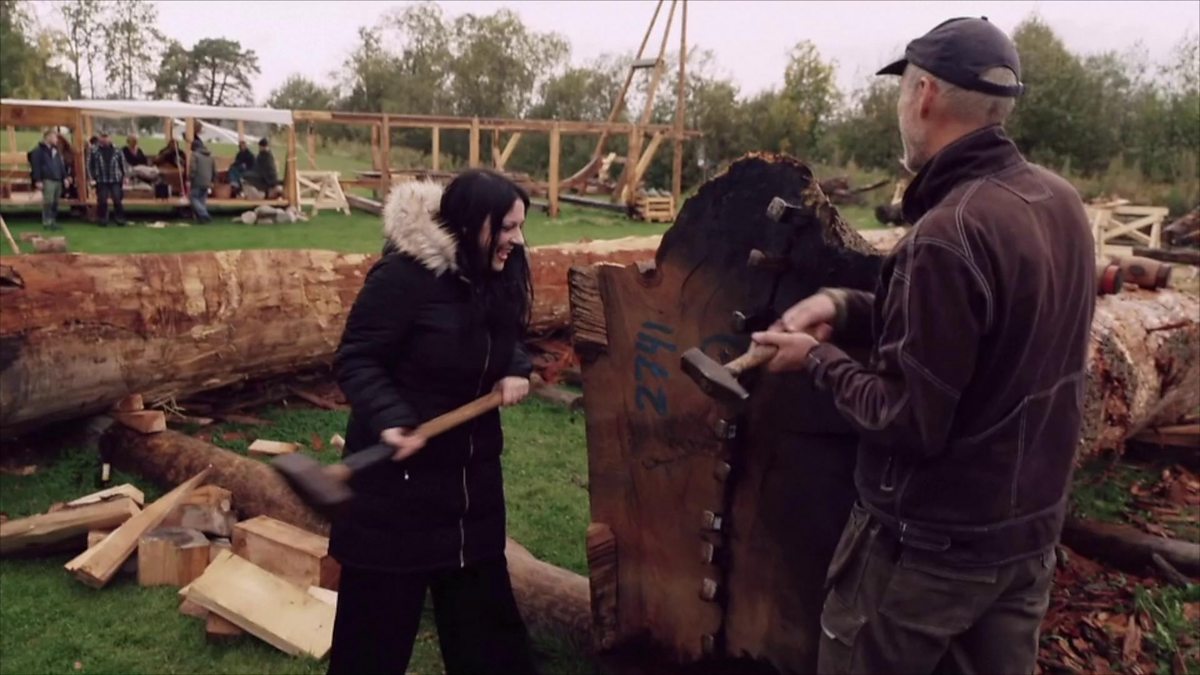 Nina is with an experimental archaeology group, and they are splitting a log to create a replica Viking ship.
