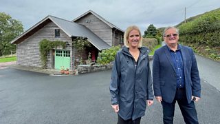 Ymweliad â hen dy ag estyniad modern ynghanol y wlad tu allan i Fachynlleth; bwthyn lli...