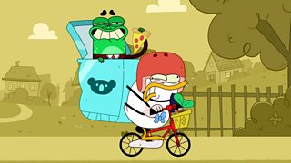 Duck has to deliver pizzas while avoiding Frog's attempts to grab them for himself.