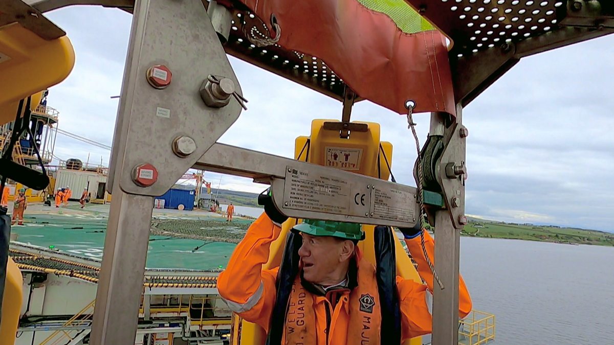 Michael explores a former oil drilling rig now moored in the Firth. He is hoisted into the air by crane as he clings to a “personnel basket" - it's not for the faint-hearted!