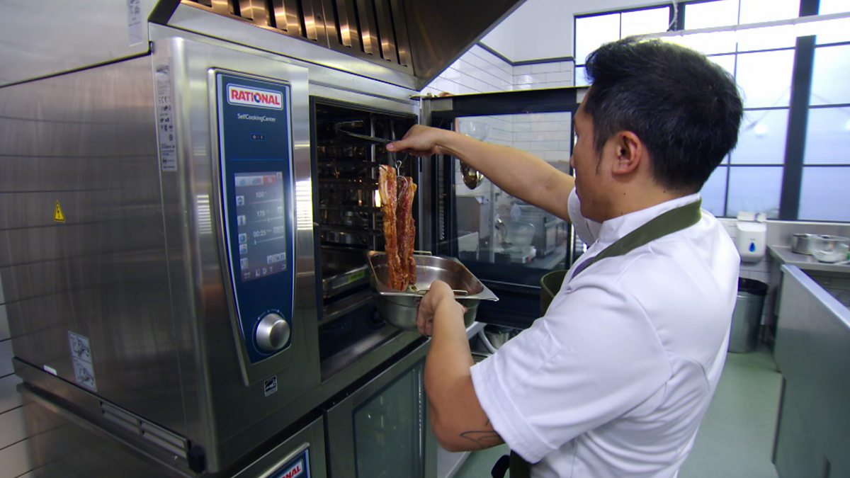 Larkin has to work fast to prepare his pork starter, which will be accompanied by pancakes and a classic Hong Kong honey mustard sauce.
