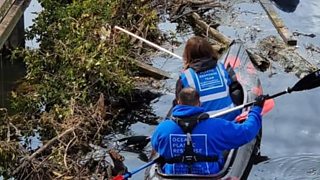 Producer Hayden challenges Jo to try litter picking on a kayak.