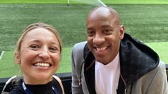 Giulia Bould with Dion Dublin, pitch side at Wembley 14 05 22