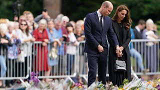 Members of the Royal Family admire floral tributes outside Balmoral, where the Queen died.