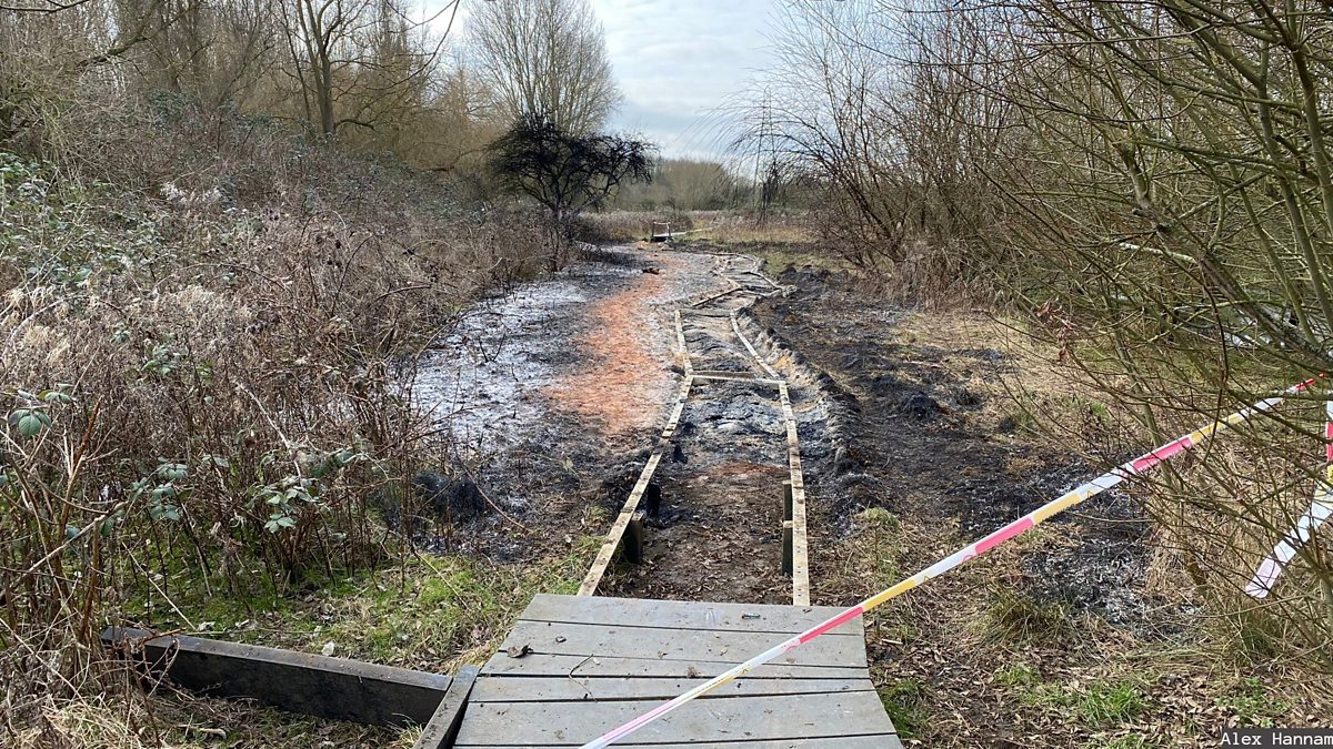 The boardwalk at Aylestone Meadows has been destroyed by arsonists limiting access to parts of the site.